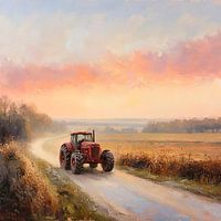 Een knalrode tractor glijdt zachtjes over een kronkelige landweg, terwijl de avondlucht oplicht in warme, zachte kleuren. De glooiende heuvels en gouden velden omlijsten het tafereel, terwijl de laatste zonnestralen het geheel betoveren met een vleugje nostalgie en landelijke charme. Een moment van pure idylle op weg naar de schemering.