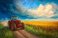 Een knalrode tractor glijdt over het stoffige zandpad, terwijl de gouden korenaren als golven dansen in de zachte wind. De dramatische lucht is geschilderd in diepe tinten blauw en grijs en omlijst de gouden zee van velden. Een foto vol rust en landelijke idylle die de magie van de natuur en het harde werk van de landbouw vastlegt.