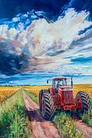 Een felrode tractor staat trots aan de rand van een goudkleurig veld, de dikke wolkenlaag erboven toont een dramatisch spel van licht en schaduw. De weg lijkt tot in het oneindige te leiden, terwijl de natuur haar kleuren ontvouwt in een harmonieus samenspel. Een ware uitdrukking van landelijke idylle!