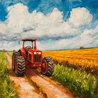 Een knalrode tractor baant zich een weg over het stoffige zandpad, omringd door gouden korenaren die wuiven in de wind. De grote, krachtige banden laten duidelijke sporen achter in de zachte aarde. Helderblauwe luchten en pluizige wolken spreiden zich uit over het tafereel, terwijl het landschap opbloeit in warme kleuren en een gevoel…