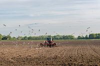 Een rode tractor ploegt de akker om vergezeld door tientallen meeuwen