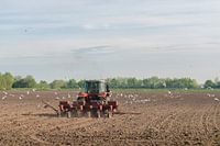 Een rode tractor ploegt de akker om vergezeld door tientallen meeuwen