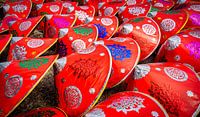 Koop de foto Rode, traditionele Vietnamese hoeden van Rietje Bulthuis als print op canvas, aluminium dibond, (ingelijste) fotoprint, behang en ArtFrame. Voor jou op maat geprint in Fine-Art kwaliteit.