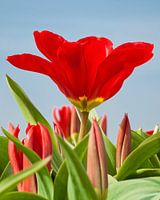 Een rode tulp is open en bloeit uitbundig. Eromheen een paar knoppen die nog dicht zitten en een paar knoppen die bijna open zijn. Deze tulpen heb ik gefotografeerd bij de bollenvelden in Lisse. Velden vol tulpen maar ook narcissen en hyacinten in allerlei kleuren.