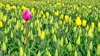 Volop lente met een enkele rode tulp volop in bloei tussen een allemaal gele tulpen nog in de knop.