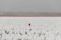 Een mooie rode tulp, verdwaald in het witte tulpenveld. Eenzaam, maar niet alleen, steekt hij boven alle witte tulpen uit en trekt zo de aandacht. Het veld met tulpen ligt op het eiland Goeree-Overflakkee in de provincie Zuid-Holland in Nederland.