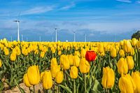 Verdwaalde rode tulp in het gele veld. Mooie horizon met windturbines