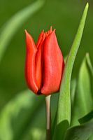 Prachtige felrode tulp in evenwicht door de zachte aanraking van haar blad.