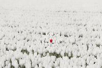 Een mooie rode tulp, verdwaald in het witte tulpenveld. Eenzaam, maar niet alleen, steekt hij boven alle tulpen uit en trekt zo de aandacht. Het veld met tulpen ligt op het eiland Goeree-Overflakkee in de provincie Zuid-Holland in Nederland.