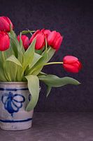 Dit is een typisch Hollandse foto. Wie kent niet tulpen uit Nederland en een ouderwetse Keulse pot. De pot is hier gebruikt als vaas voor de bos bloemen. De donkere achtergrond van behang met motief en de gemarmerde ondergrond contrasteren mooi met de deze lente bloeiers. Het geheel is modern maar is geïnspireerd door middeleeuwse schilderijen. Dit stilleven past dus in elk soort interieur als je van een stevig kleuraccent houdt. De uitsnede is gewaagd en zeker niet standaard.
