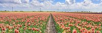 Een panorama beeld tijdens de lente van een Hollands landschap met bloeiende rode tulpen, in de achtergrond een spoorlijn.