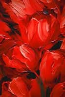 Rode tulpen in een schilderij. Dit digitale kunstwerk van rode tulpen is een levendige en uitnodigende weergave van de natuurlijke schoonheid van deze bloemen. De tulpen staan in volle bloei. De rode kleur is intens en levendig, waardoor de tulpen een krachtig visueel statement maken.