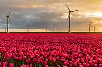 Tulpen in een veld tijdens een prachtige lente zonsondergang in de Noordoostpolder in Flevoland, Nederland. Op de achtergrond produceert een rij windturbines duurzame elektriciteit.