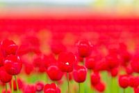 Rode tulpen in een veld. Kleurrijke verzadigde foto met een beperkte scherptediepte.