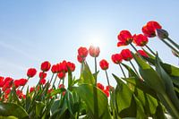 Koop dit bloemen kunstwerk Rode tulpen in tegenlicht vanaf laag standpunt van Henk van den Brink op canvas, aluminium dibond, (ingelijste) fotoprint, behang en ArtFrame, op maat geprint in Fine-Art kwaliteit.