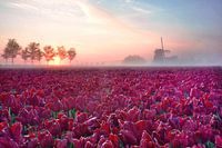 Rode tulpen met molen bij zonsopkomst op een mistige ochtend in de Beemster