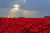 Bollenveld met rode tulpen in het voorjaar in Dirksland, Goeree-Overflakkee. De zon schijnt in stralen op de rode bloemen. In de lente zijn de bollenvelden op Goeree net zo mooi als in de Bollenstreek.