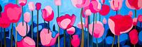 Rode en roze tulpen steken af tegen een levendige blauwe achtergrond in een abstracte en zacht versmolten voorstelling