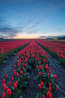 Dese foto is genomen in het voorjaar van 2021 bij Hillegom. Het is een combinatie van een paar foto's om ervoor te zorgen dat de belichting en focus overal goed is. Het was laat in de avond dus ik heb gebruik gemaakt van een statief en langere sluitertijd (4 seconde). De diepte en fel rode kleur van de tulpen ben ik erg blij mee
