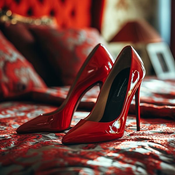 Dit stijlvolle kunstwerk toont een paar glanzende rode hoge hakken die op een luxueus bed met rode stoffen en patronen staan. Het intense kleurenpalet en het warme licht geven de scène een sensuele en elegante sfeer. Deze afbeelding straalt verleiding, zelfvertrouwen en sensuele spanning uit. De glanzende rode hoge hakken fungeren als…