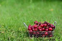 Op een weiland staat een mandje van metaal met verse rode kersen