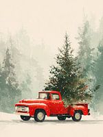 Dit kunstwerk toont een klassieke rode truck die een prachtig versierde kerstboom vervoert door een besneeuwd landschap. De felrode kleur van de wagen steekt warm af tegen de zachte, mistige achtergrond van dennenbomen en sneeuwvlokken. Op de achterbak ligt de boom stevig vast, rijkelijk gevuld met groene takken en subtiele lichtjes die feestelijke warmte uitstralen. De sneeuw dwarrelt zachtjes naar beneden en geeft het geheel een nostalgische en dromerige sfeer. Het beeld roept herinneringen op aan traditionele kerstmomenten: het ophalen van de boom, de rit naar huis en de gezelligheid die volgt. Het werk combineert eenvoud met emotie en straalt een tijdloze charme uit. De rode truck en de groene kerstboom vormen samen een iconisch kerstbeeld dat symbool staat voor samenzijn, traditie en feestvreugde.