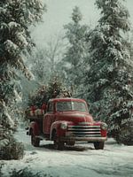 Een klassieke rode truck staat geparkeerd tussen met sneeuw bedekte dennenbomen. Achterin liggen zorgvuldig ingepakte cadeaus en een versierde kerstboom vol warme lichtjes. De sneeuw dwarrelt zacht naar beneden, waardoor het tafereel een betoverende rust uitstraalt. De rode lak van de truck steekt prachtig af tegen het koele wit en groen van de omgeving. Elk detail – van de glanzende kerstballen tot het verweerde metaal van de wagen – draagt bij aan een gevoel van nostalgie. Het lijkt een moment bevroren in de tijd, vol warmte en herinnering. De scène ademt de sfeer van een klassieke kerstkaart, waar traditie en natuur samenkomen. De zachte verlichting en het winterse licht creëren een poëtische balans tussen kou en gezelligheid. Een ode aan de charme van vervlogen tijden, gevangen in een schilderachtig winters landschap.