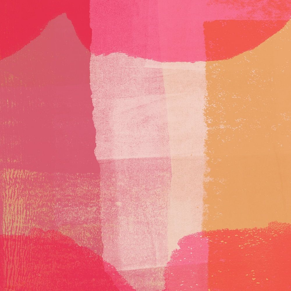 Mixed media collage van monotypes, texturen, organische vormen in warme kleuren.