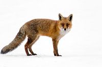 Een rode vos (Vulpes vulpes) in de sneeuw met een volledig witte achtergrond van sneeuw.