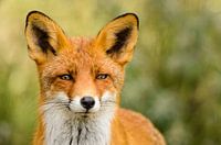 Een portret van een rode vos (Vulpes vulpes) met een groene achtergrond. De foto is genomen in de duinen en betreft een wilde vos.