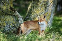 Deze prachtige rode vos is te vinden in de Nederlandse duinen, vlakbij de kust. De rode (of eigenlijk oranje) kleur van de vos steekt mooi af tegen de groene vegetatie. Tussen de bomen en op het gras schijnt de zon, ook de vos wordt op sommige delen mooi uitgelicht. De heldere ogen trekken de aandacht in de foto. Geweldig zo'n wilde vos in de duinen!