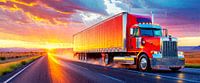 In dit panoramische formaat als digitaal schilderij ontvouwt zich de krachtige aanwezigheid van een Amerikaanse truck in felrood terwijl hij met adembenemende snelheid over een met regen doordrenkte snelweg raast. De compositie is gecentreerd aan de rechterkant van de foto, waar het imposante voertuig domineert. De roodgeverfde carrosserie schittert in het licht van de ondergaande zon, waarvan de gouden en oranjekleurige stralen de hemel aan de linkerkant van het beeld overspoelen en worden weerkaatst op het glanzende oppervlak van de lange truck, zodat rood, geel en oranje in elkaar overvloeien.