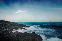 Een felrode zeilboot dobbert op de brede blauwe Middellandse Zee en vormt een schril contrast met de rotsachtige kust op de voorgrond. De zachte golven en een enkele wolk dragen bij aan de rust en diepte van de scène. Het kleurenpalet is rustig, met zachte blauwtinten en diepzwarte tinten die een serene en uitnodigende sfeer creëren.