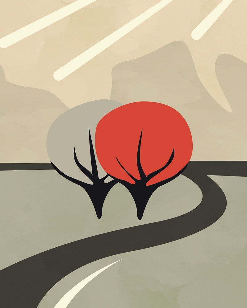 Minimalistisch-abstract landschap met vijf gestileerde bomen die staan langs een rivier, verre heuvels op de achtergrond en de opkomende zon. De kleuren zijn beperkt tot varianten van warm grijs en groen-grijs, natuurwit en aardbeien-rood, wat zorgt voor een mooi contrast.