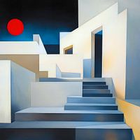 Geometrische architecturale structuren met scherpe lijnen en hoeken zijn afgebeeld onder een donkere hemel met een felrode cirkel die op een zon lijkt. De compositie wordt gekenmerkt door een minimalistische stijl en een koel kleurenpalet, waardoor een surrealistische, dromerige sfeer ontstaat.
