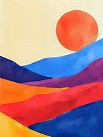 Een zonsondergang in warme kleuren over kleurrijke velden, bergen en woestijn in contrasterende kleuren