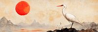 Rode zon en witte kraanvogel bij zonsopkomst Japandi panorama van Digitale Schilderijen