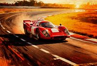 Met elke penseelstreek probeer ik meer dan alleen een auto vast te leggen; ik probeer een moment van pure energie te vangen. Dit Porsche 917-schilderij is mijn ode aan een tijdperk van rauwe kracht en iconisch design. Terwijl ik de vurige rode tinten en diepe schaduwen neerleg, voel ik het geronk van de motor en de hitte die opstijgt uit het asfalt bij zonsondergang. Mijn doel was om deze legendarische machine te bevriezen in de tijd, zijn vorm die door het gouden licht snijdt terwijl hij de bocht van het circuit beheerst.