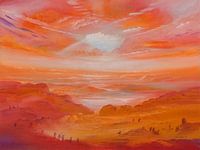 Dit schilderij wordt gekenmerkt door een ongebruikelijk kleurenschema en is overwegend in een diepe tint rood. De overheersende rode kleur strekt zich uit over de voorgrond, waar rode bomen worden afgewisseld met oranjekleurige vegetatie. Een roodachtig pad slingert door dit levendige landschap. Dit intense rood brengt een sfeer van…