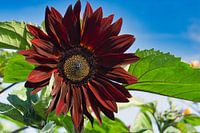 Donkerrode zonnebloem met op de achtergrond een prachtig blauwe lucht.