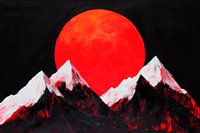 Een pulserende rode bol van zonlicht stijgt majestueus op boven besneeuwde bergtoppen waarvan de toppen gloeien in het licht. Het contrast tussen dramatisch zwart en gloeiend rood nodigt uit tot dromen. Dit kunstwerk verrijkt elke woonkamer met zijn krachtige uitstraling en geeft de kamer een mystieke, uitnodigende sfeer.
