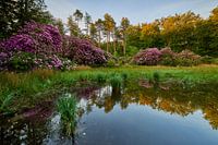Rododendrons bij zonsopkomst aan een begroeid meer in de bossen van Nunspeet op de Veluwe. Deze Rododendron staat bij het voormalige Ronde Huis, een gebied gelegen aan de Van Petersom Ramringweg in Nunspeet. Op verschillende plaatsen in het gebied zijn deze struiken te vinden, onder andere bij de meertjes in het gebied.