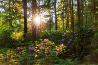 De zon gaat onder in een fris bos met paars bloeiende rododendrons tussen rechte boomstammen.