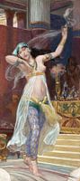 De topless dame danst een traditionele dans uit het jodendom in Brazilië. De vrouw draagt een broek in blauw en een doorzichtig kleed onder een ceintuur. Daarboven is de meid naakt waardoor haar borsten bloot zijn en zwaait het haar zwierig.