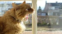 Een kat die gaapt voor het raam.