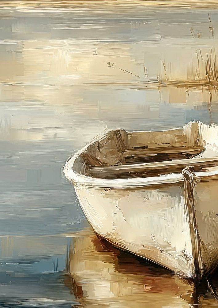 Een olieverfschilderij toont een roeiboot aan de oever van een stil, verlaten meer, geschilderd in zachte beige tinten en neutrale kleuren. Zachte verlichting en gedetailleerde penseelstreken geven diepte en structuur aan de scène. De op vintage geïnspireerde schilderstijl benadrukt de rust en sereniteit van het landschap. Het kalme water en de harmonieuze compositie creëren een vredige, meditatieve sfeer. Dit kunstwerk vangt de rustige schoonheid van de natuur en is ideaal voor liefhebbers van impressionistische olieverfschilderijen, serene landschappen en decoratieve wandkunst die rust en natuurlijke harmonie uitstraalt.