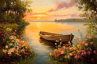 De zonsondergang glinstert in zachte kleuren over het glinsterende water, terwijl een eenzame boot zachtjes op de oever schommelt. Kleurrijke bloemen omlijsten het uitzicht en geven het tafereel een idyllisch tintje. De vredige sfeer nodigt je uit om het alledaagse leven achter je te laten en te genieten van de schoonheid van de natuur.