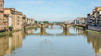 Een roeier op de rivier de Arno in de stad Florence. Florence is een stad in de regio Toscane in Italië. Op de achtergrond één van de verschillende bruggen die de verschillende stadsdelen verbinden.