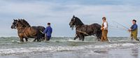 Demonstratie lancering van de roeireddingboot Secretaris Schumacher door de Stichting Museumreddingboot op het Waddeneiland Terschelling met behulp van vrijwilligers, tien Friese paarden, tien roeiers en een stuurman.