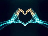 Deze afbeelding toont twee handen die samen een hartvorm maken, weergegeven als röntgenbeeld. De botstructuren van vingers, handpalmen en polsen zijn duidelijk zichtbaar in blauw en zachtgeel, tegen een donkere achtergrond. De combinatie van medische precisie en symboliek maakt dit beeld krachtig en positief.